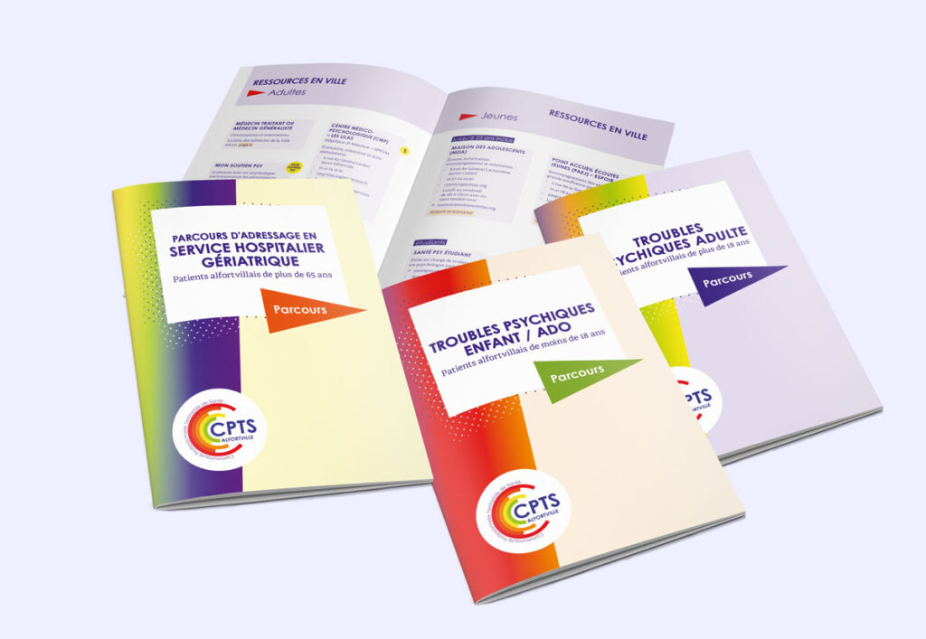 L’association CPTS a déployé 4 documents à l’attention des professionnels de santé, médico-sociaux et sociaux de son territoire. J’ai conçu ces brochures A5 comme une collection. Chaque document a son pendant numérique, avec les liens permettant d’accéder à plus de ressources : site internet, formulaires, etc.